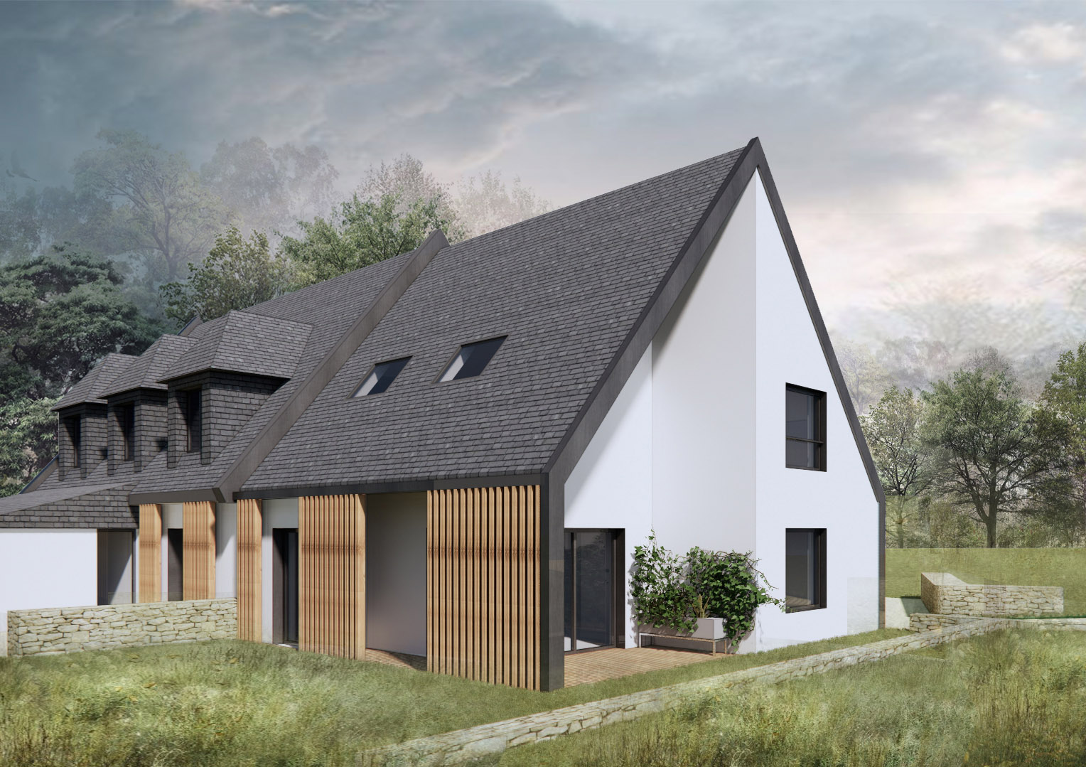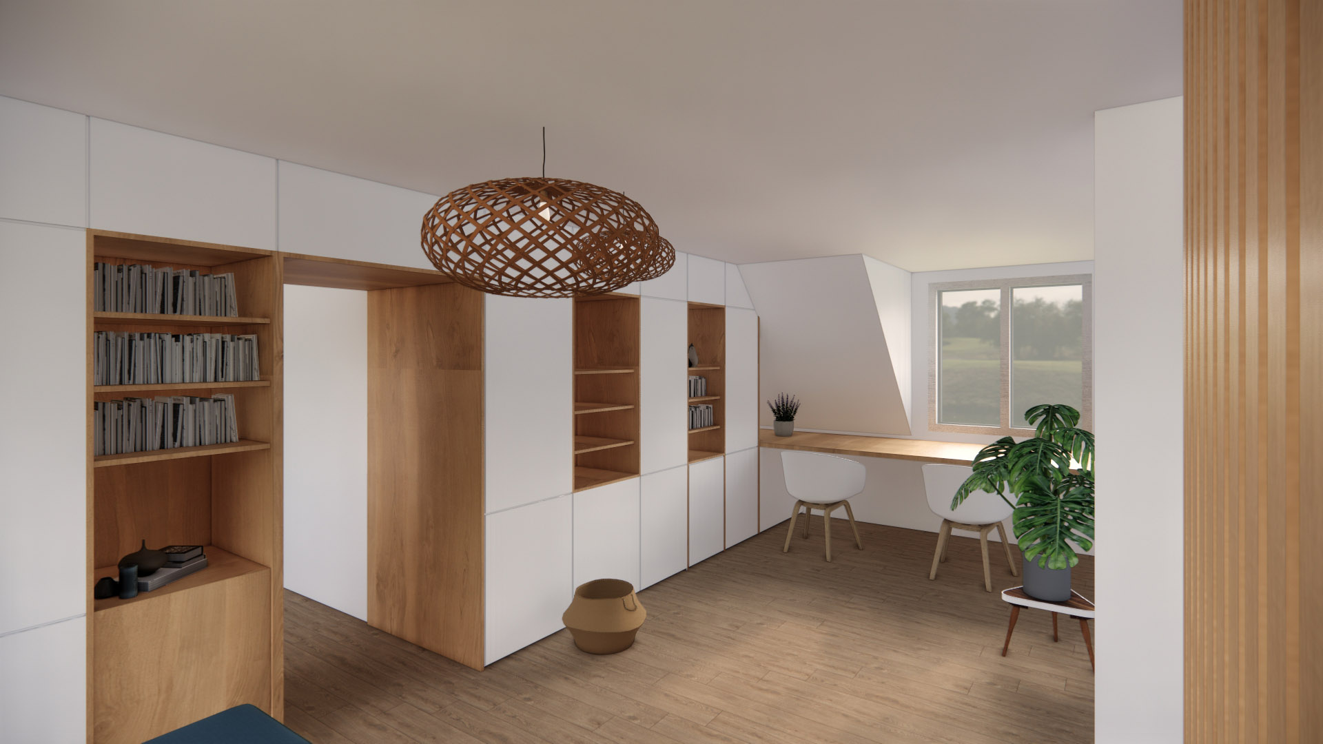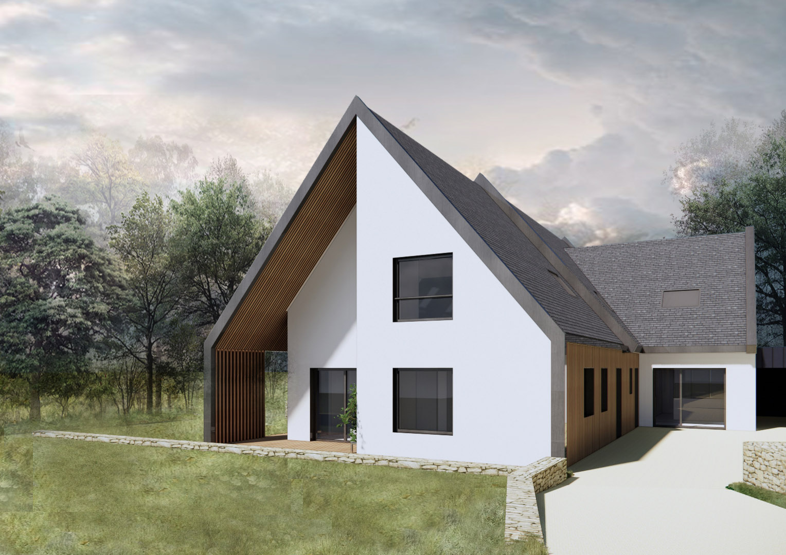 Dans ce hameau situé non loin de la côte, la maison DG se caractérise par une écriture typique de la région, toiture double pente en ardoise, chevronnières, corniches… La commande : un studio indépendant en RDC, une chambre parentale à l’étage et la rénovation partielle de l’existant. Les études d’esquisse ont permis à la cliente d’affirmer son souhait, celui d’un projet d’extension s’inscrivant en cohérence avec le bâti existant tout en apportant une note contemporaine à la façade d’entrée. Le fil rouge était trouvé. Le projet consiste donc à reprendre les gabarits et codes de l’architecture existante. Cherchant à apporter légèreté à l’ensemble, le volume est sculpté sur son pignon Est dans le strict axe du faitage et surmonté d’une ligne marquant ses arêtes, comme pour réinterpréter la traditionnelle chevronnière de la côte bretonne. Le volume ainsi creusé permet de dégager une terrasse extérieure privative pour le studio du RDC. Une peau, composée de bardage bois en façade Nord et en lame bois créant coursive et protection solaire au Sud, harmonise l’ensemble et confond extension et existant.