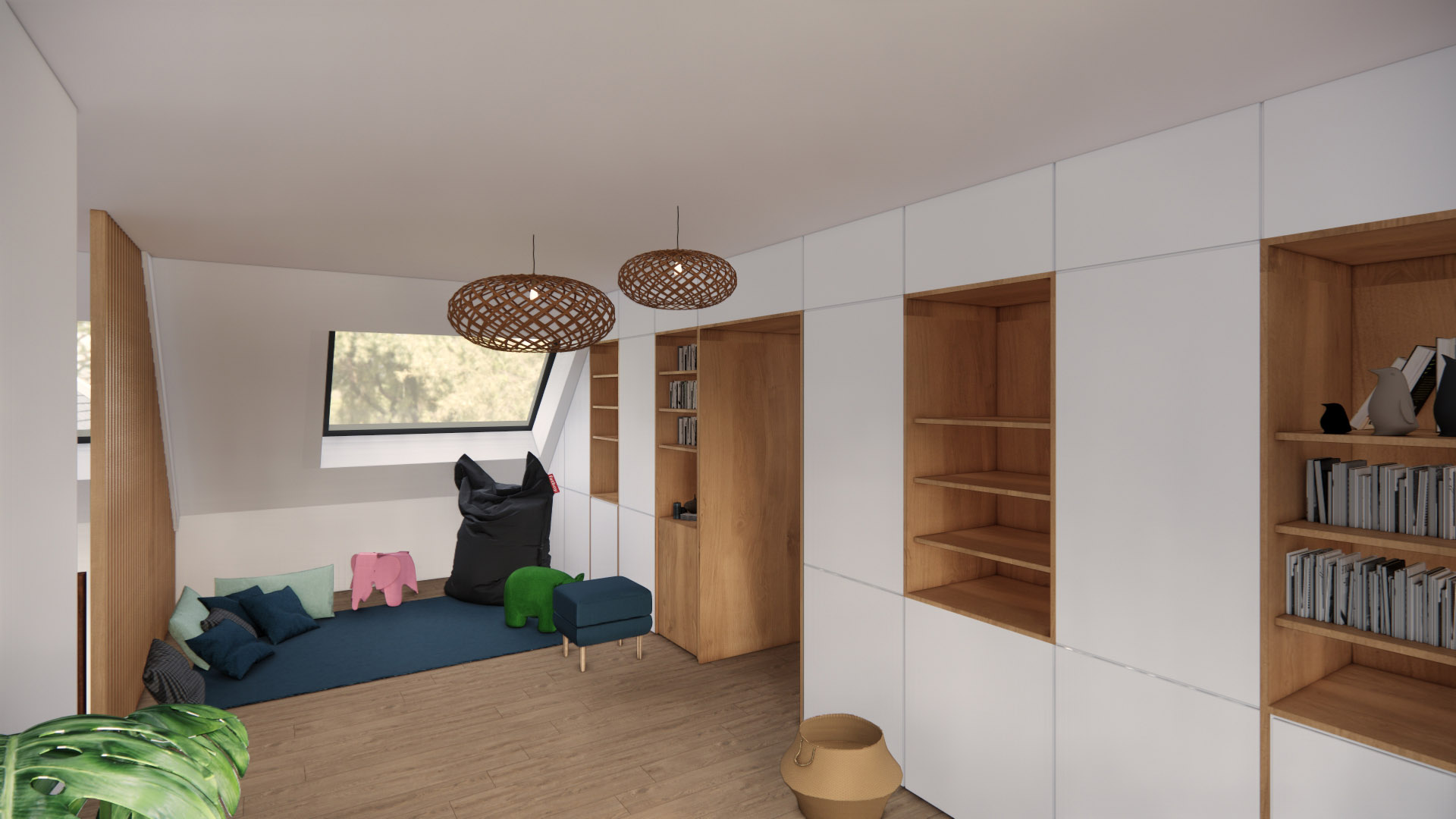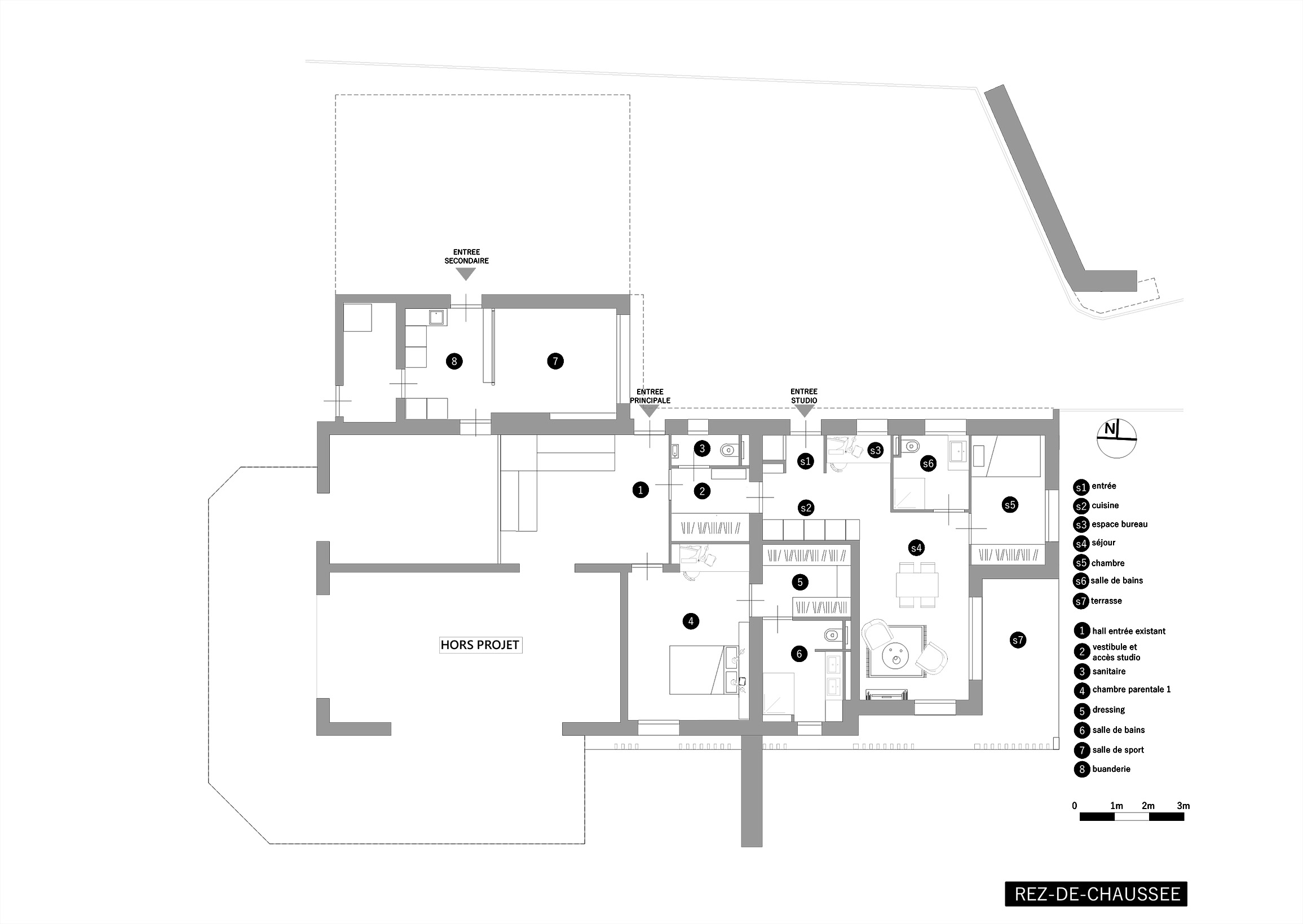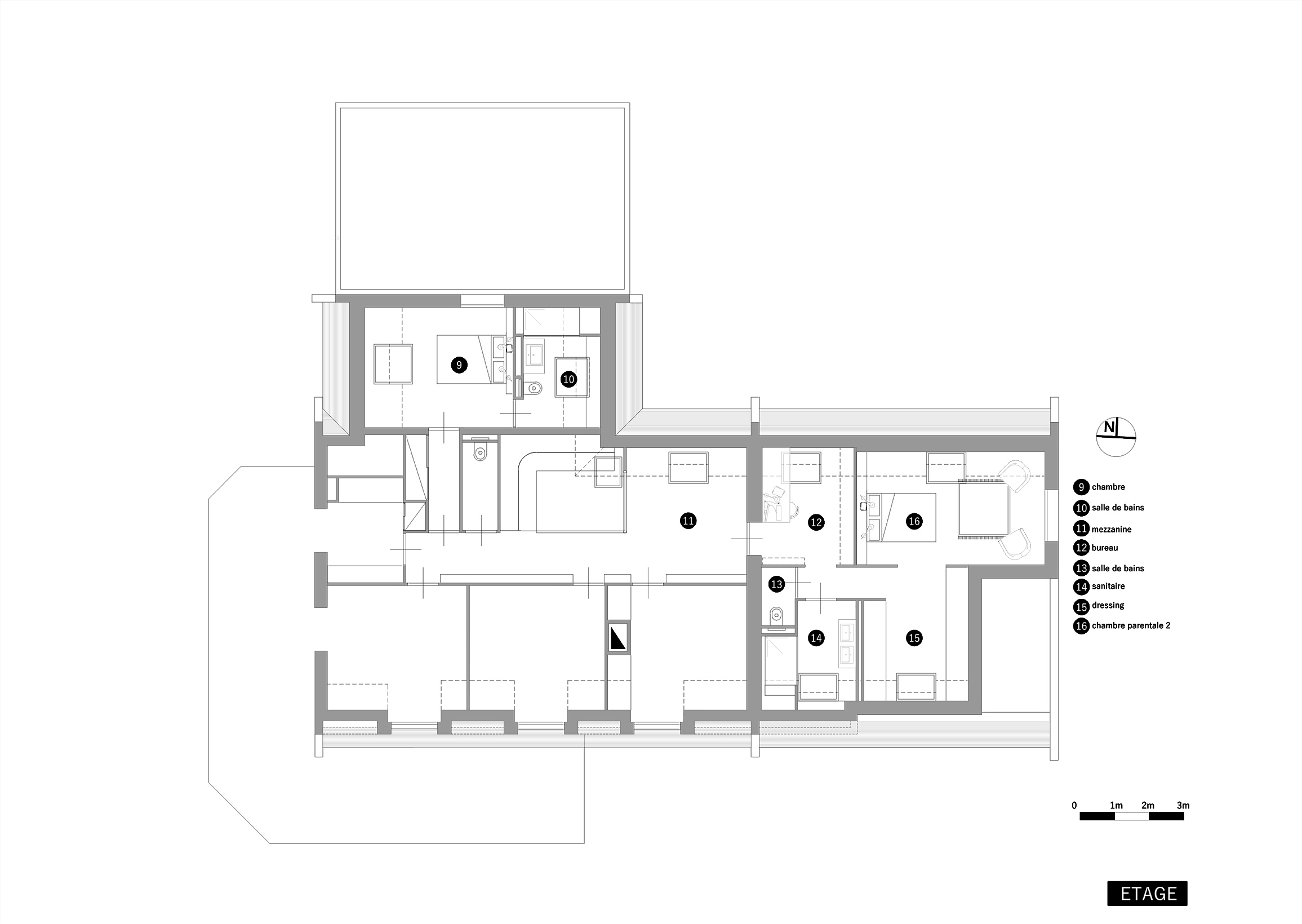 Dans ce hameau situé non loin de la côte, la maison DG se caractérise par une écriture typique de la région, toiture double pente en ardoise, chevronnières, corniches… La commande : un studio indépendant en RDC, une chambre parentale à l’étage et la rénovation partielle de l’existant. Les études d’esquisse ont permis à la cliente d’affirmer son souhait, celui d’un projet d’extension s’inscrivant en cohérence avec le bâti existant tout en apportant une note contemporaine à la façade d’entrée. Le fil rouge était trouvé. Le projet consiste donc à reprendre les gabarits et codes de l’architecture existante. Cherchant à apporter légèreté à l’ensemble, le volume est sculpté sur son pignon Est dans le strict axe du faitage et surmonté d’une ligne marquant ses arêtes, comme pour réinterpréter la traditionnelle chevronnière de la côte bretonne. Le volume ainsi creusé permet de dégager une terrasse extérieure privative pour le studio du RDC. Une peau, composée de bardage bois en façade Nord et en lame bois créant coursive et protection solaire au Sud, harmonise l’ensemble et confond extension et existant.