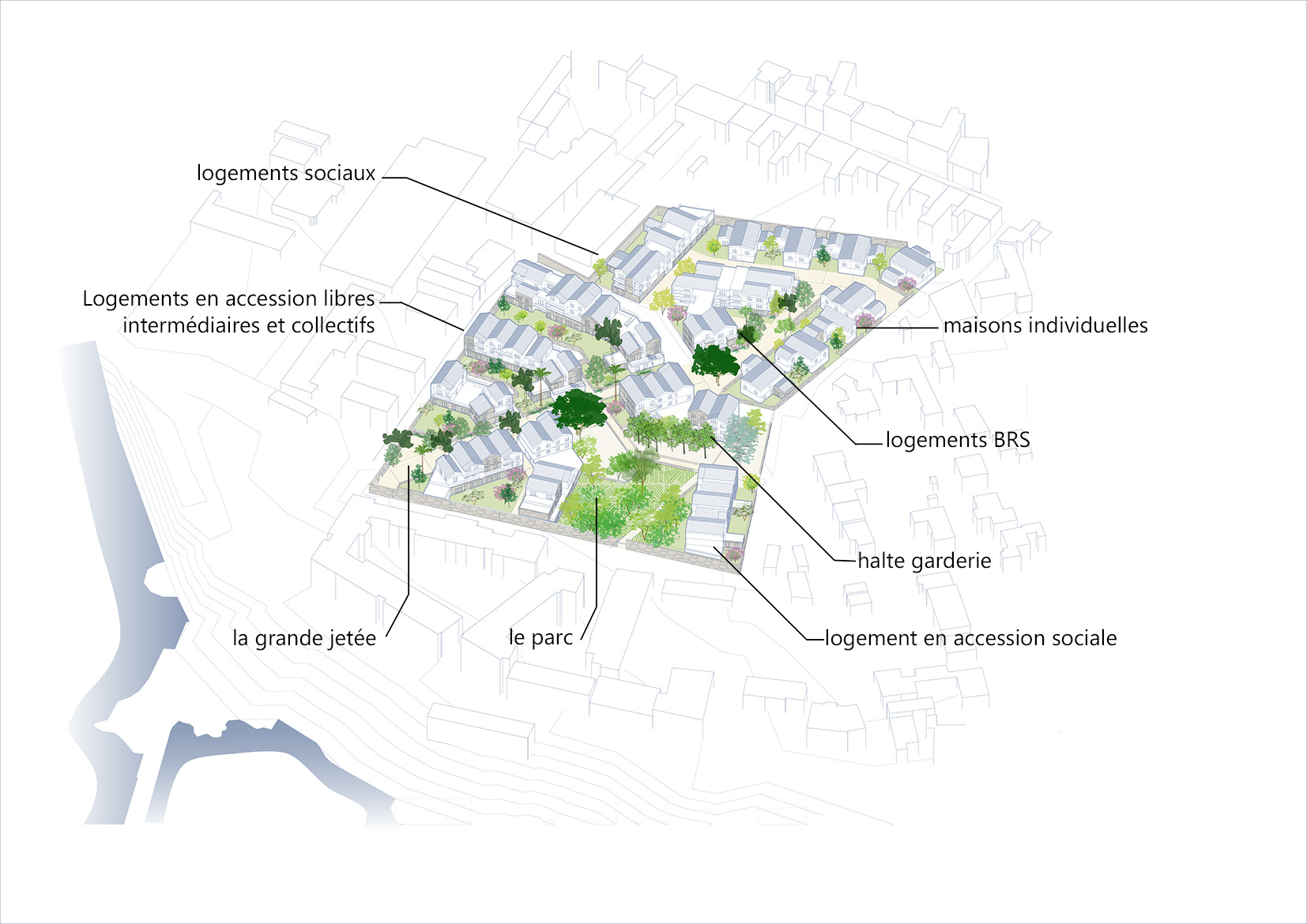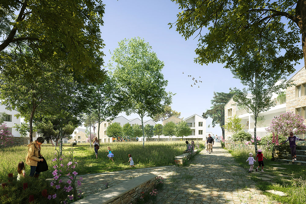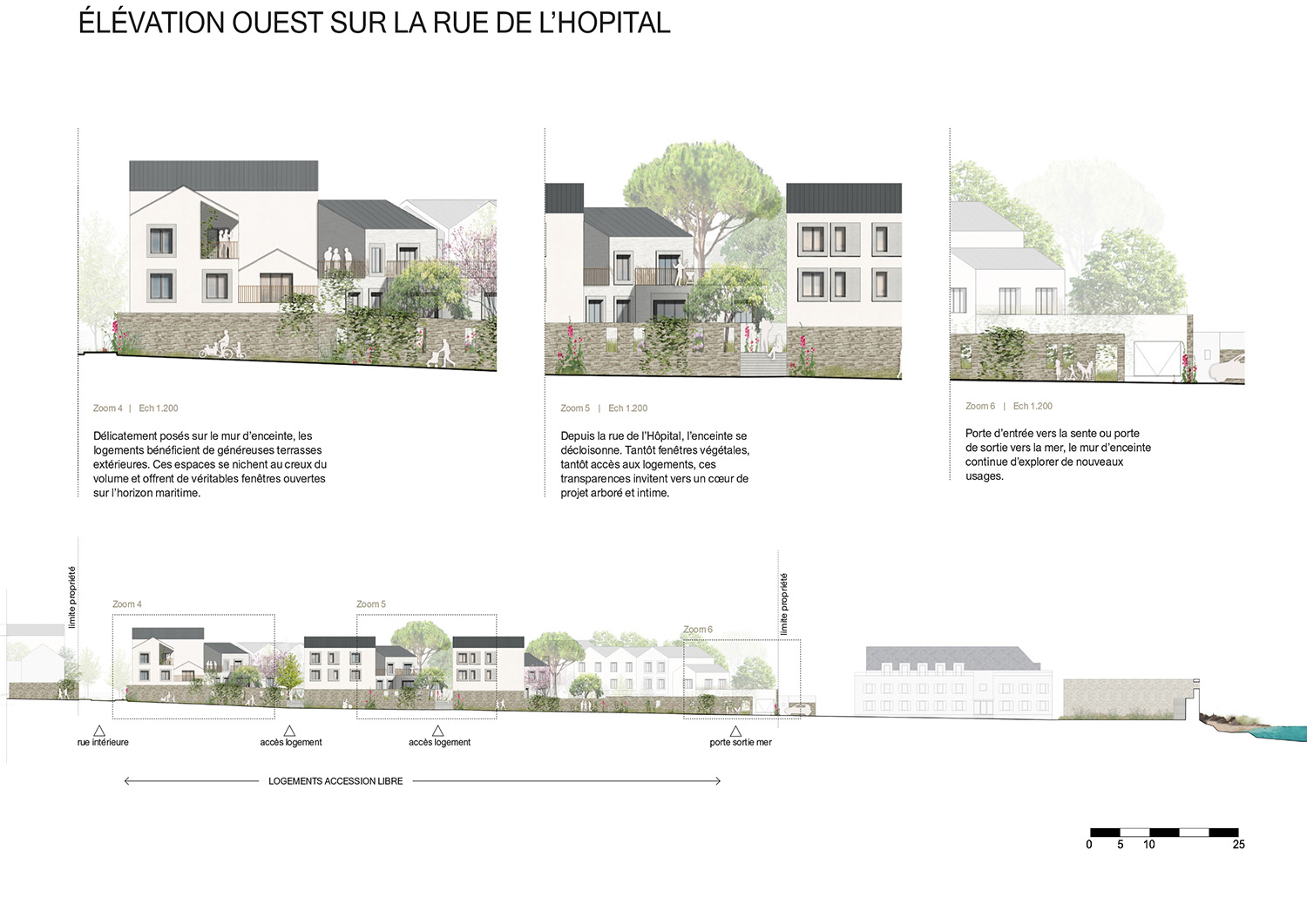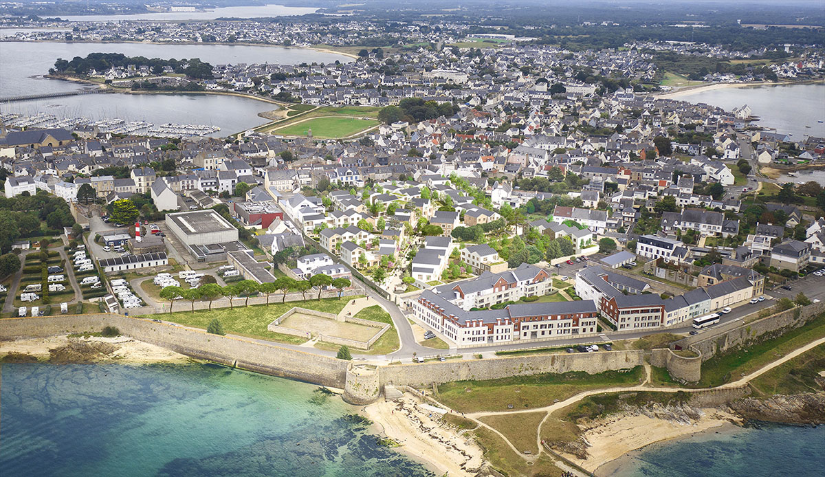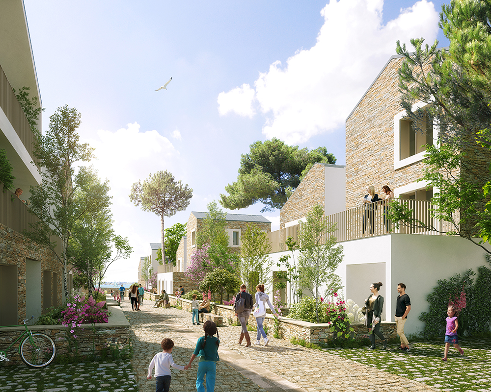 Le concours pour la transformation du site de l’ancien hôpital de Port-Louis porte sur la construction d’un ensemble de logements et d’une petite halte-garderie. Le projet tire parti des qualités intrinsèques d’un site exceptionnel, son histoire, ses murs qui ceinturent le site et soulignent sa topographie, son patrimoine végétal et bien évidement sa proximité avec l’océan. Les programmes cohabitent autour d’une trame d’espaces libres variés, connectés aux rues limitrophes, tout en intégrant largement le vivant qui se maintient dans la ville. Les terrasses, façades et espaces libres deviennent des supports de végétalisation qui contribuent à la biodiversité, au bien-être des habitants et luttent contre les effets d’îlot de chaleur. Les nouveaux volumes s’implantent avec courtoisie afin de préserver la qualité de vie du quartier. Les cheminements créés sont des fils reliant les rues et les places, le site s’ouvre à son quartier, vers le littoral. Le droit au ciel, à la mer et au soleil est défini comme une nécessité pour les logements. Le projet cherche à maximiser les vues lointaines, que ce soit depuis les espaces de déambulation ou directement depuis son logement. Le jeu volumétrique et la position des prolongements extérieurs ont été organisés pour offrir cette vue à un maximum de logements. La morphologie générale répond également au défi de la densité désirable. Elle est un outil au service de l’acceptabilité du projet pour les riverains. Chaque sous-ensemble bâti s’enrichit d’un travail plus fin et précis sur sa silhouette urbaine afin de créer des volumes variés, singuliers. Ce travail participe à fragmenter le tout afin de proposer des volumes similaires à ceux du quartier alentour. Les hauteurs, les alignements ou les retraits, les pentes de toiture et les orientations des faîtages, les toitures terrasses, les loggias et les balcons sont au service d’une écriture architecturale composite. Il en ressort une ambiance résidentielle apaisée et courtoise.
