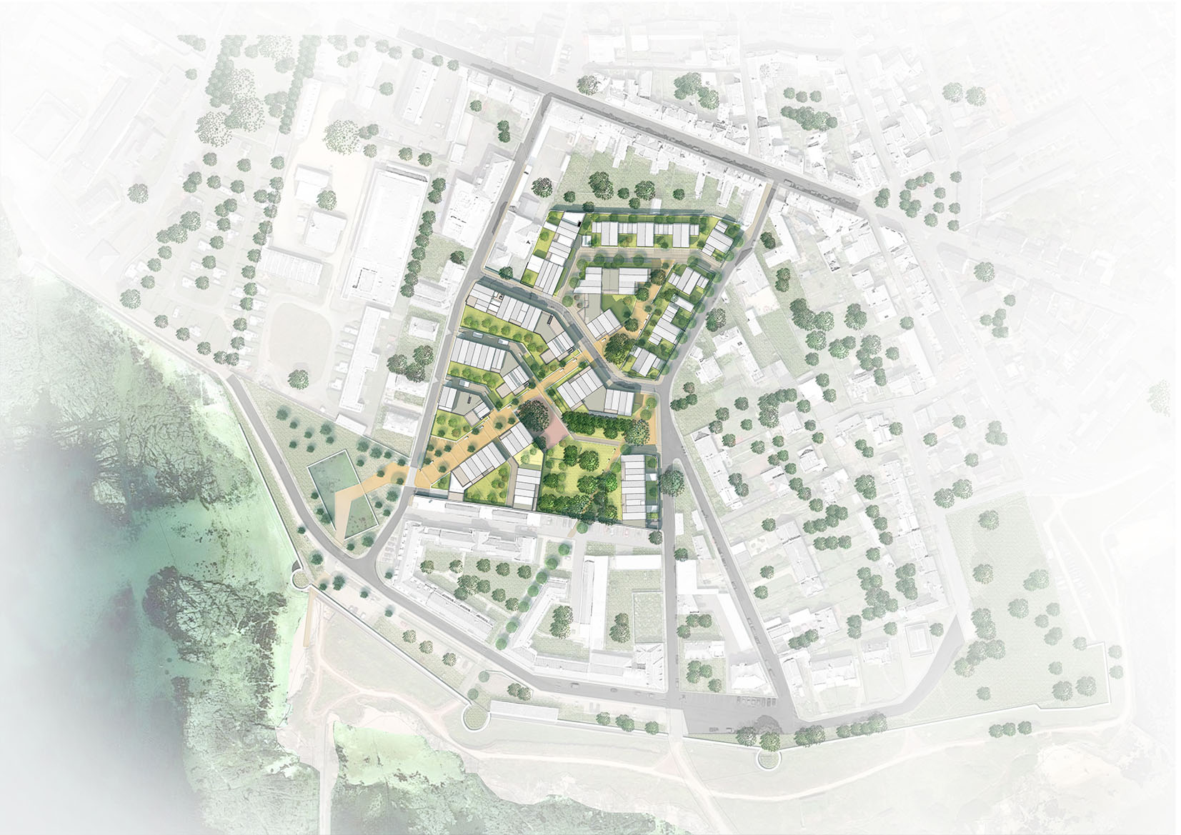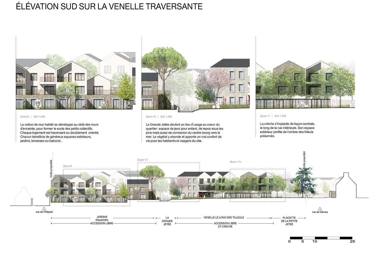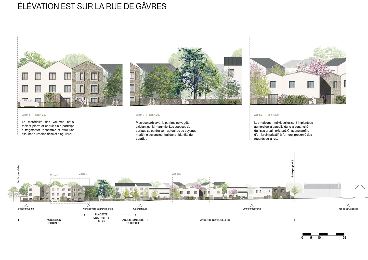 Le concours pour la transformation du site de l’ancien hôpital de Port-Louis porte sur la construction d’un ensemble de logements et d’une petite halte-garderie. Le projet tire parti des qualités intrinsèques d’un site exceptionnel, son histoire, ses murs qui ceinturent le site et soulignent sa topographie, son patrimoine végétal et bien évidement sa proximité avec l’océan. Les programmes cohabitent autour d’une trame d’espaces libres variés, connectés aux rues limitrophes, tout en intégrant largement le vivant qui se maintient dans la ville. Les terrasses, façades et espaces libres deviennent des supports de végétalisation qui contribuent à la biodiversité, au bien-être des habitants et luttent contre les effets d’îlot de chaleur. Les nouveaux volumes s’implantent avec courtoisie afin de préserver la qualité de vie du quartier. Les cheminements créés sont des fils reliant les rues et les places, le site s’ouvre à son quartier, vers le littoral. Le droit au ciel, à la mer et au soleil est défini comme une nécessité pour les logements. Le projet cherche à maximiser les vues lointaines, que ce soit depuis les espaces de déambulation ou directement depuis son logement. Le jeu volumétrique et la position des prolongements extérieurs ont été organisés pour offrir cette vue à un maximum de logements. La morphologie générale répond également au défi de la densité désirable. Elle est un outil au service de l’acceptabilité du projet pour les riverains. Chaque sous-ensemble bâti s’enrichit d’un travail plus fin et précis sur sa silhouette urbaine afin de créer des volumes variés, singuliers. Ce travail participe à fragmenter le tout afin de proposer des volumes similaires à ceux du quartier alentour. Les hauteurs, les alignements ou les retraits, les pentes de toiture et les orientations des faîtages, les toitures terrasses, les loggias et les balcons sont au service d’une écriture architecturale composite. Il en ressort une ambiance résidentielle apaisée et courtoise.