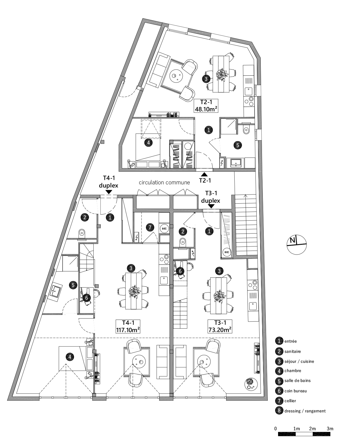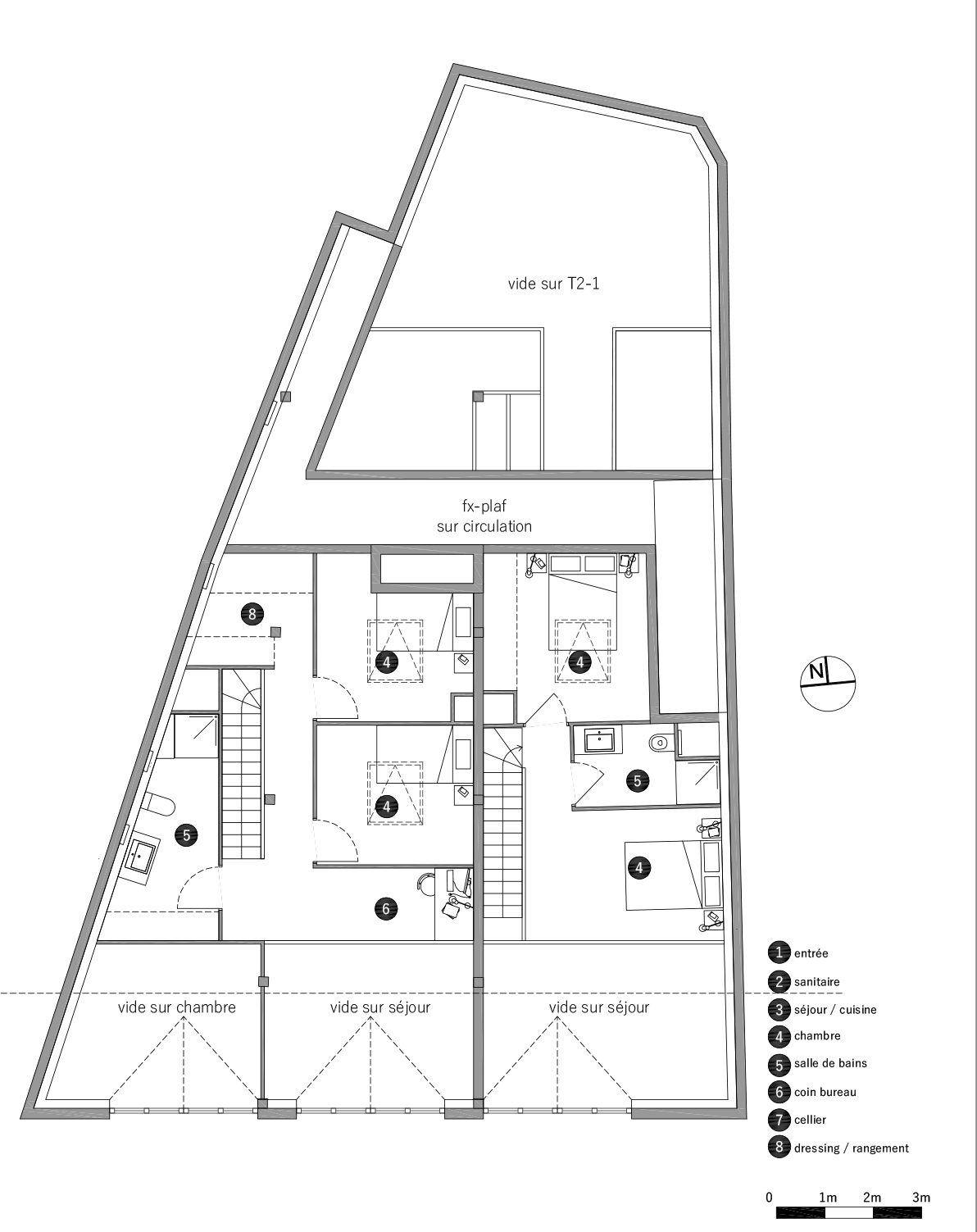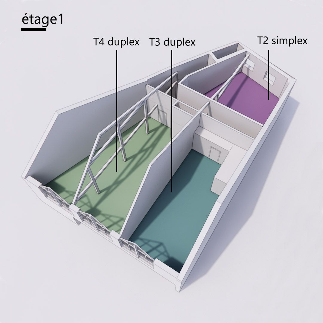 Cette étude de faisabilité porte sur l’aménagement d’un plateau libre en 3 logements collectifs à l’étage d’un local commercial.