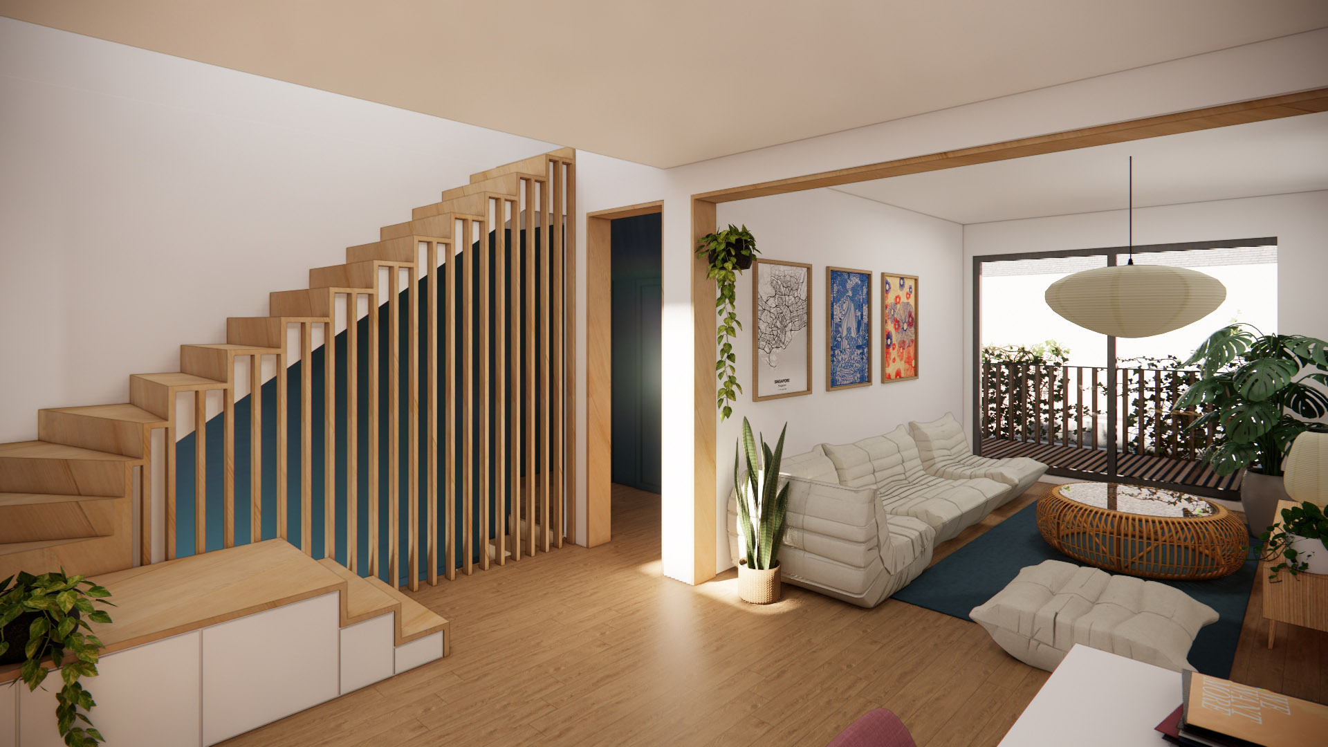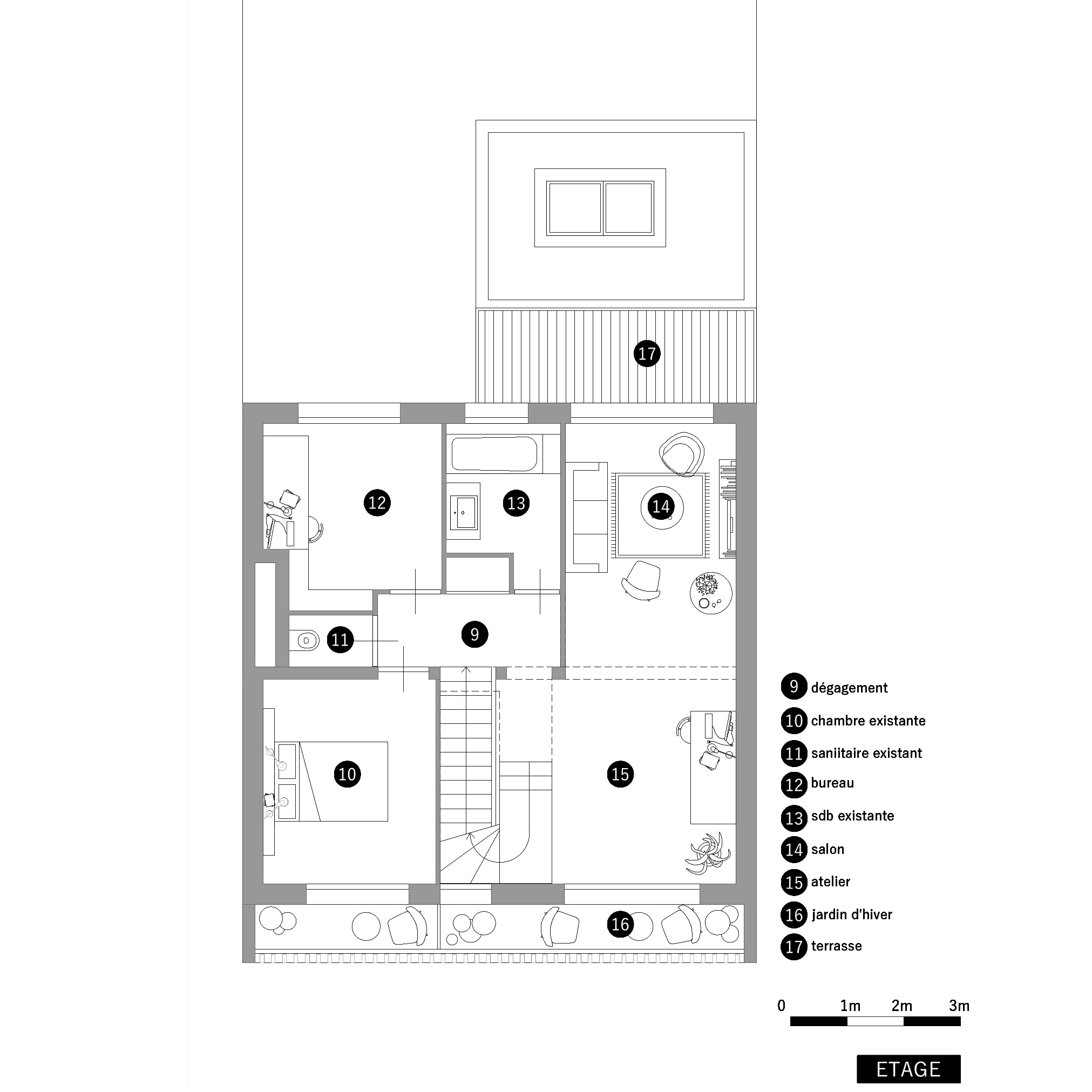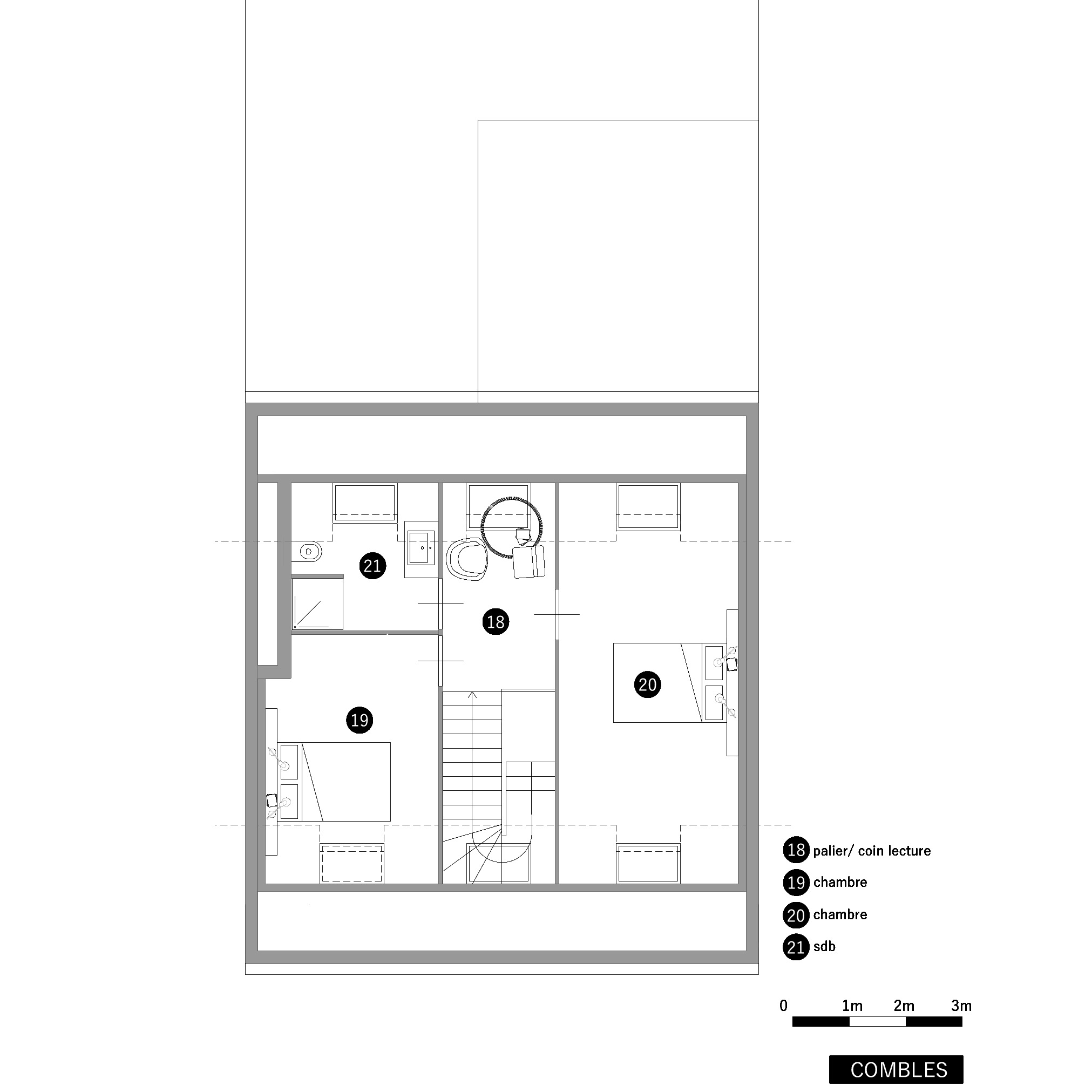 L’étage est repensé comme un espace polyvalent et modulable, chambre, bureau, petit salon, atelier. Le petit salon s’ouvre sur une terrasse au-dessus de l’extension et profite également de la vue sur jardin. L’escalier existant est conservé et décloisonné. Dans la continuité, un nouvel escalier est imaginé pour l’accès aux combles aménagés. Cet escalier, à la ligne sobre, est imaginé comme un élément de mobilier caractérisant l’espace. C’est l’occasion de créer un nouveau puits de lumière (en façade Sud cette fois) qui profite pleinement à ce lieu de vie.