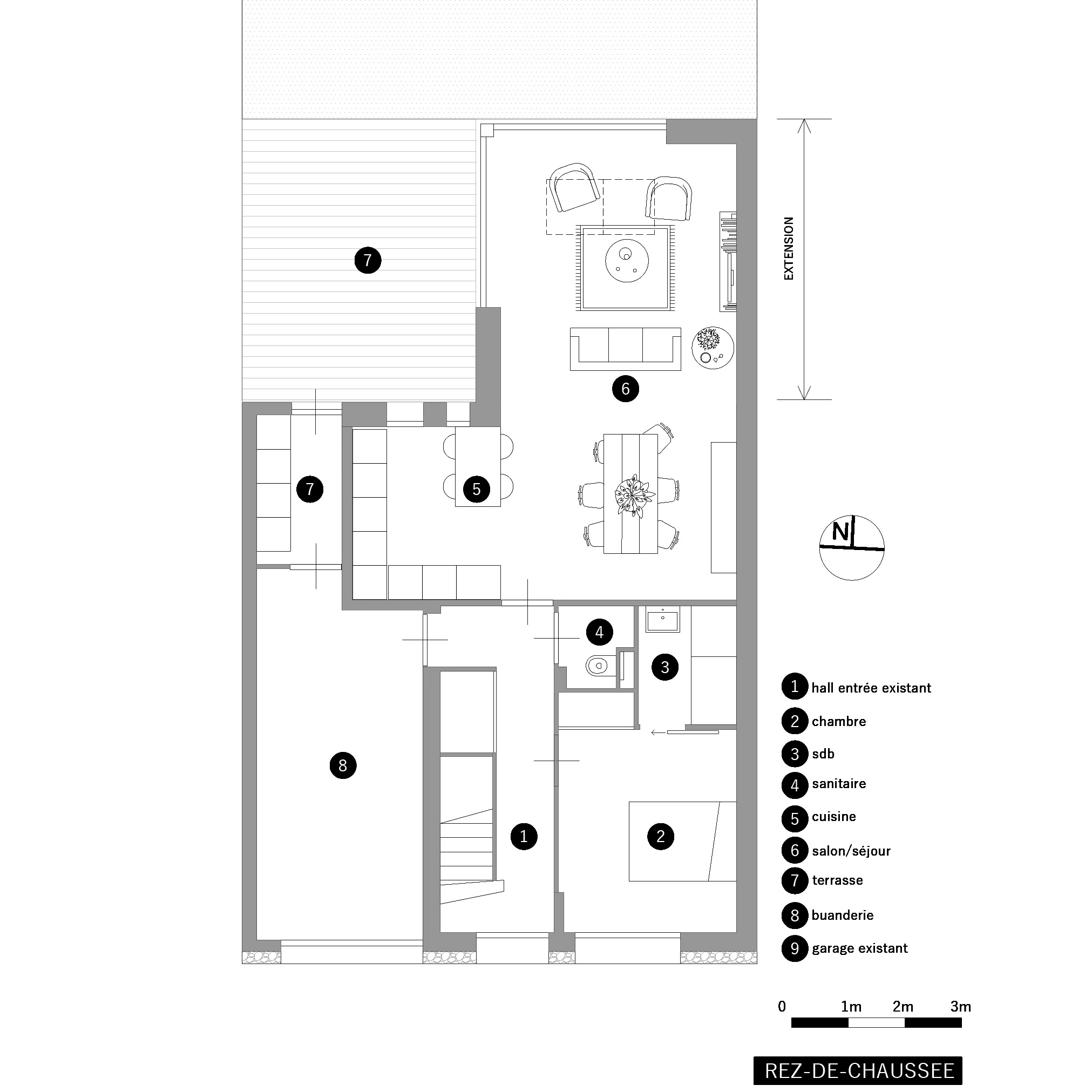 Le réaménagement du RDC et son extension sur le jardin au Nord a questionné l’extrême nécessité de l’accès à la lumière naturelle. Afin de compenser cette exposition Nord, l’extension de 5mx5m est implantée sur la limite Est du jardin. Cette configuration permet de dégager une petite terrasse à l’ouest de 20m² en lien avec le salon et la cuisine. Couplé de généreuses baies vitrées sur le jardin, d’un puits de lumière zénithale et des quelques rayons de l’Ouest, l’espace intérieur du salon capte ainsi un maximum de luminosité. L’extension est conçue en ossature bois et habillée d’un bardage bois naturel favorisant une ambiance chaleureuse et une image contemporaine au projet.