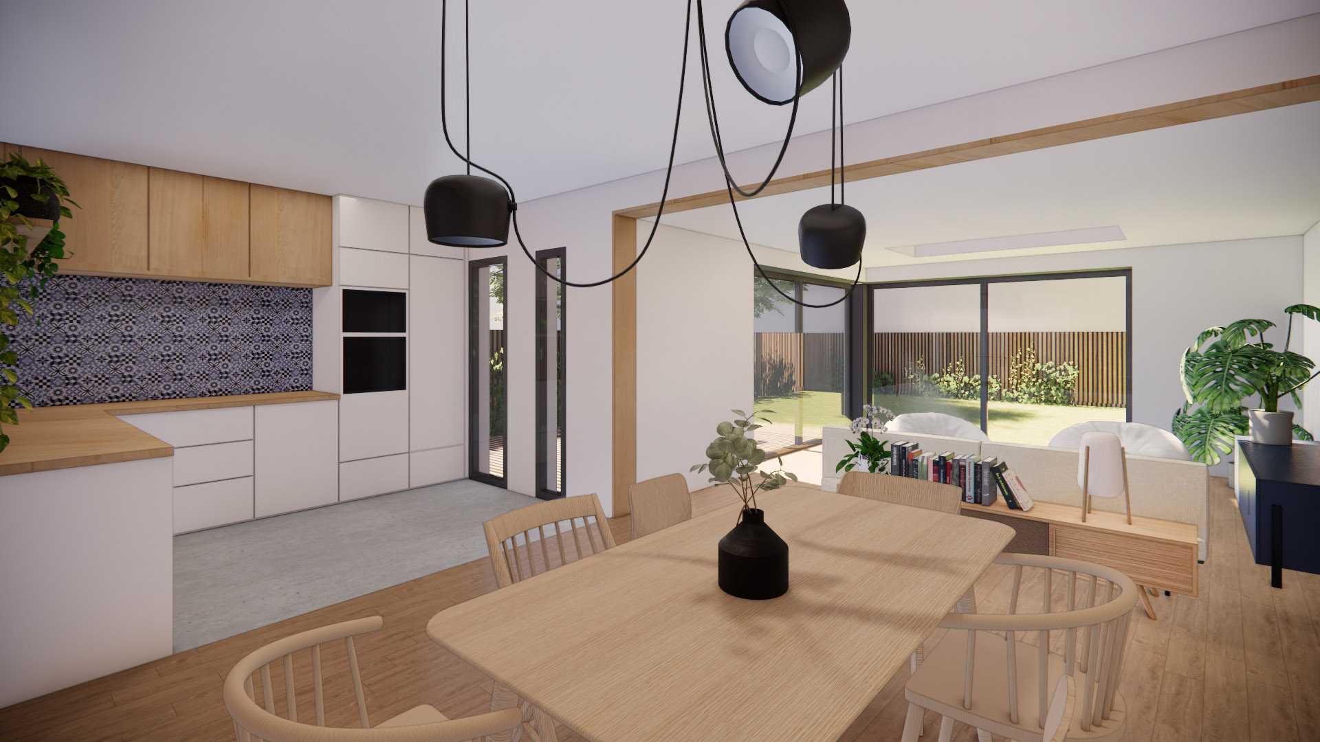 Pour ce projet de rassemblement familial, la famille LVBW souhaite rénover l’ensemble de la maison, aménager les combles, retrouver les espaces de vie à RDC avec la création d’une extension afin de profiter pleinement du jardin, et aménager une cellule de vie accessible aux personnes à mobilité réduite.