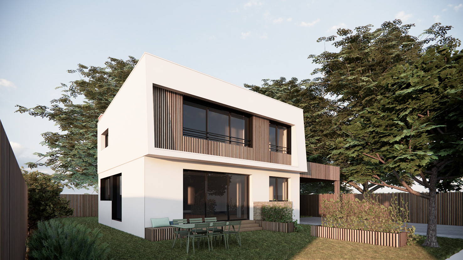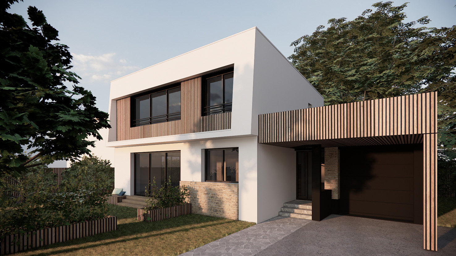 L’harmonisation des volumes rapportés : Aligné au volume principale de la maison, un auvent formant carport rassemble les volumes du garage et de l’entrée afin d’harmoniser l’ensemble et reléguer la lecture de ces excroissances au second plan. L’auvent est habillé d’un bardage bois afin de ne pas démultiplier les matériaux de façade.