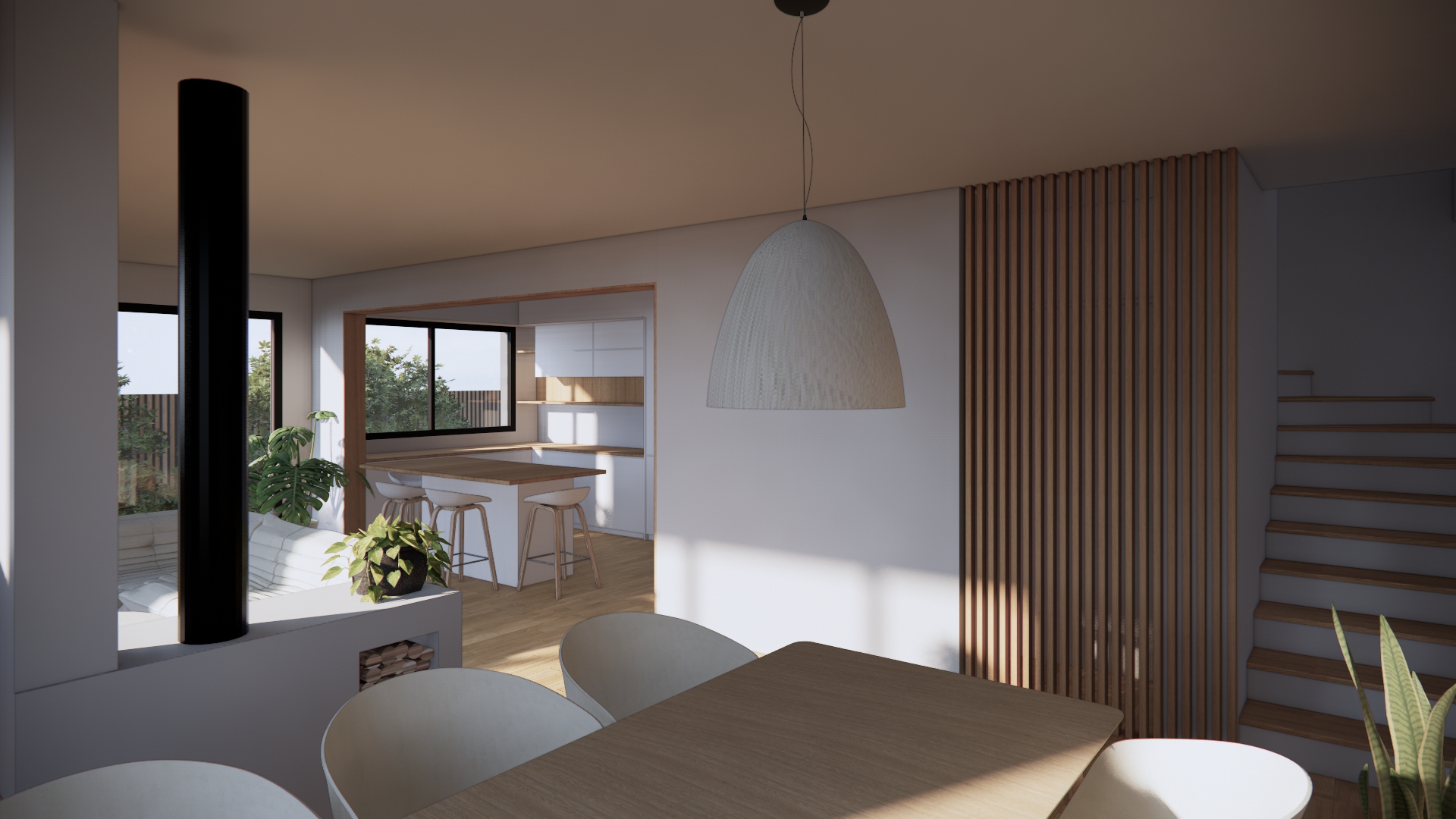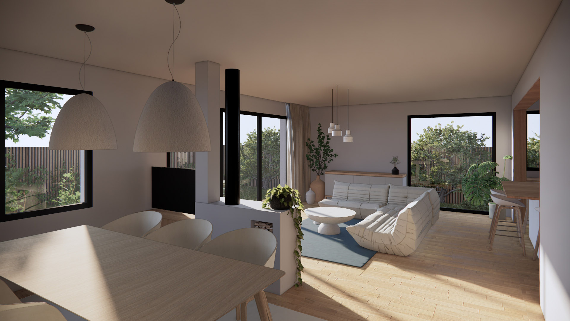 L’ouverture sur l’extérieur : pour répondre à un besoin d’espace et de lumière, le RDC est entièrement décloisonné, les baies vitrées sur allèges sont agrandies. L’espace de vie se trouve ainsi baigné de lumière naturelle, filtrée par la végétation existante, et largement ouvert sur son jardin, floutant ainsi la limite intérieur/extérieur.