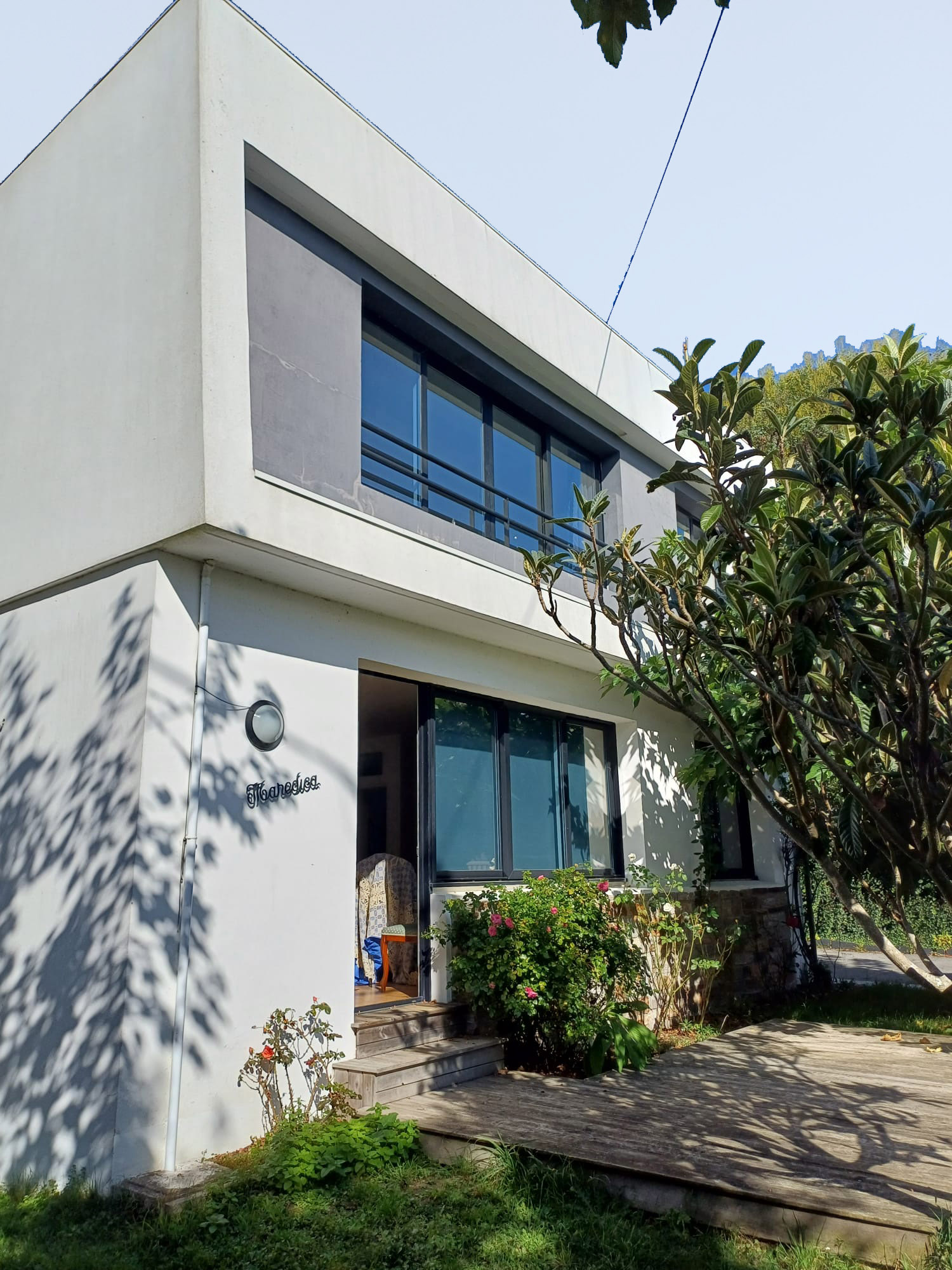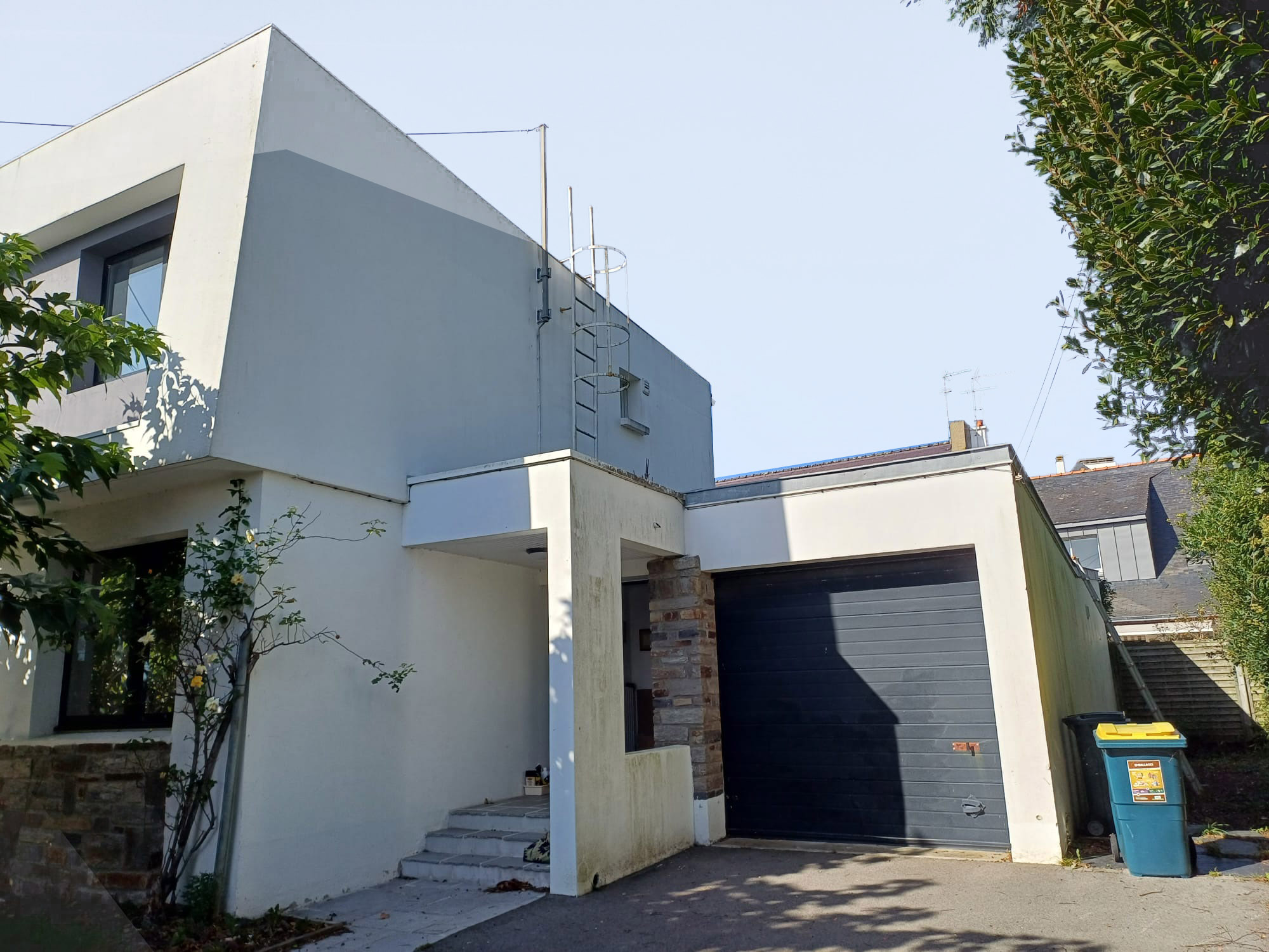 Proche de la rade, dans un quartier résidentiel au tissu discontinu, la maison NSC, au charme certain, est marquée par une architecture moderne des années 60, toiture à faible pente mono-orientée, de larges baies vitrées horizontales sur allège, volume de l’étage en léger porte à faux … seules les extensions du garage et du auvent d’entrée sont des ouvrages rapportés au dessin initial.